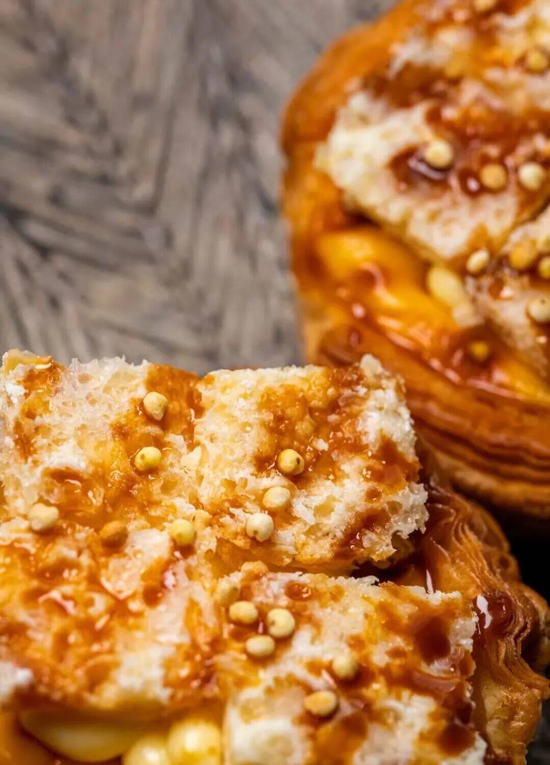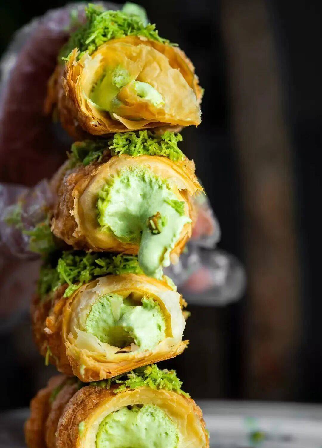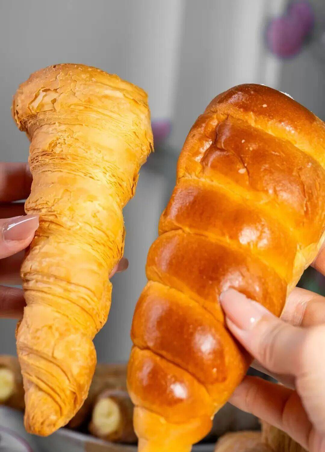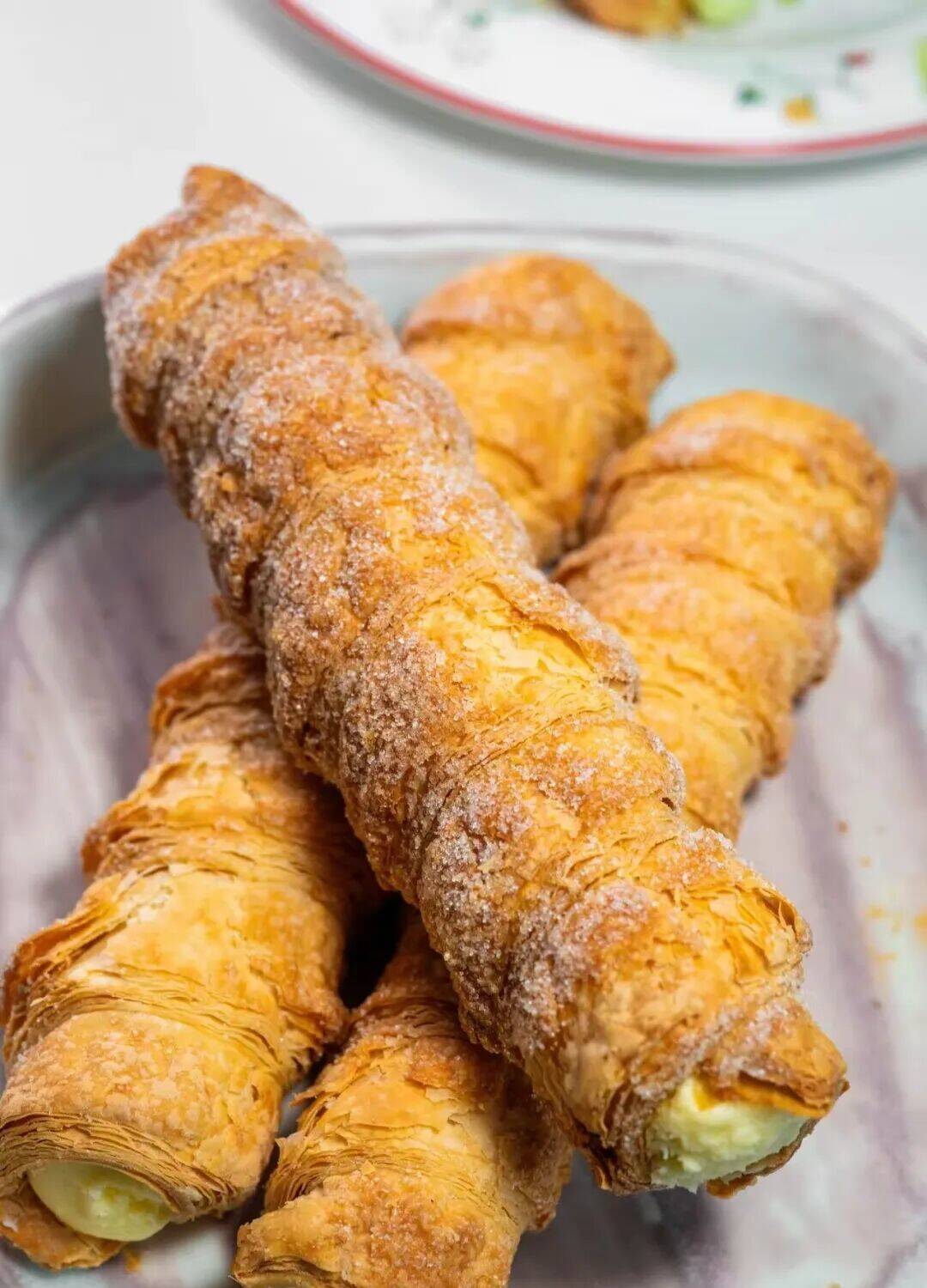 “奶油号角”,原型或为奶油馅丹麦卷及日式改良款。老式带面包皮,新款多为起酥皮,酥脆层叠与爆浆内馅更是受到不少人的喜爱。